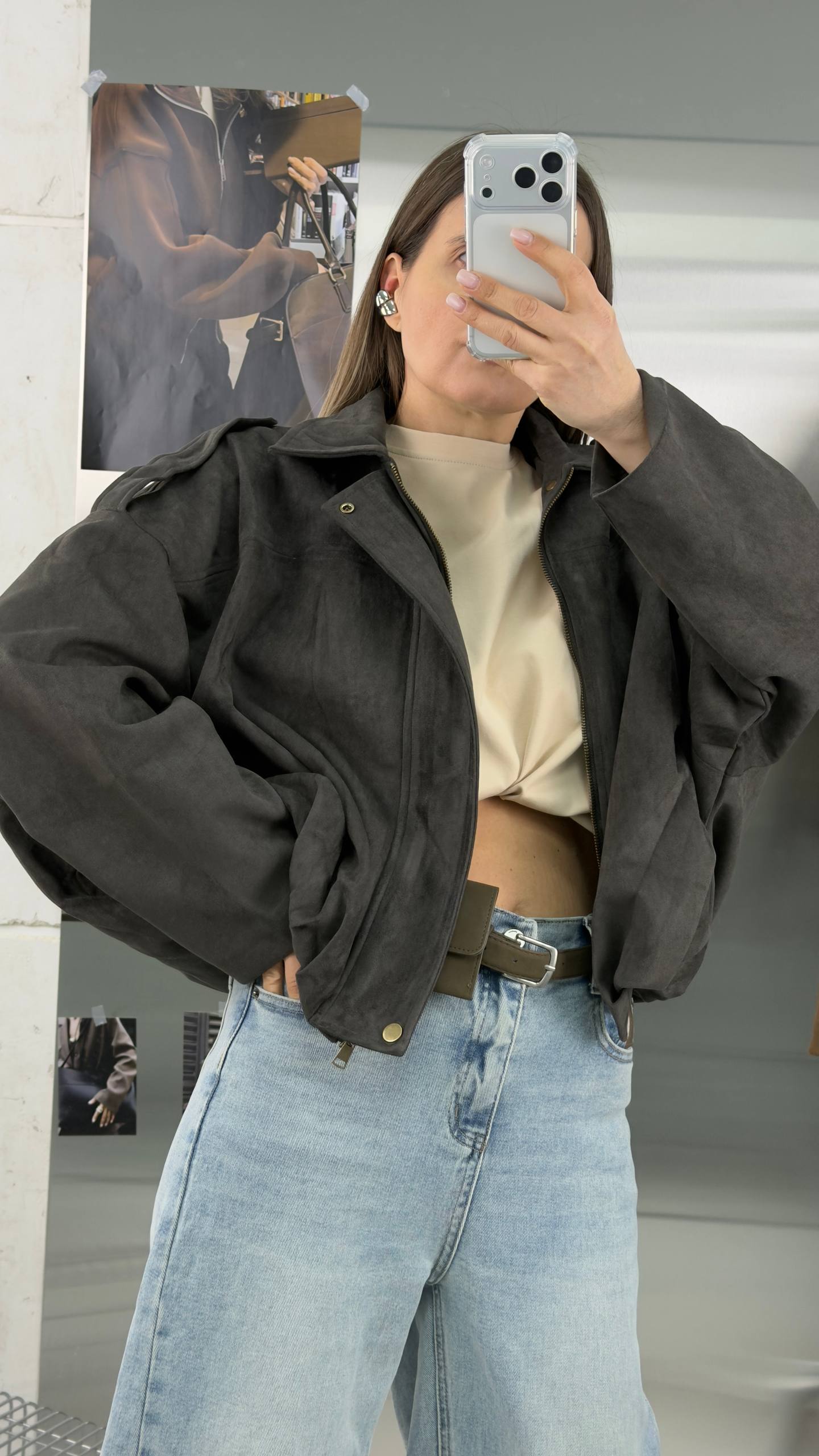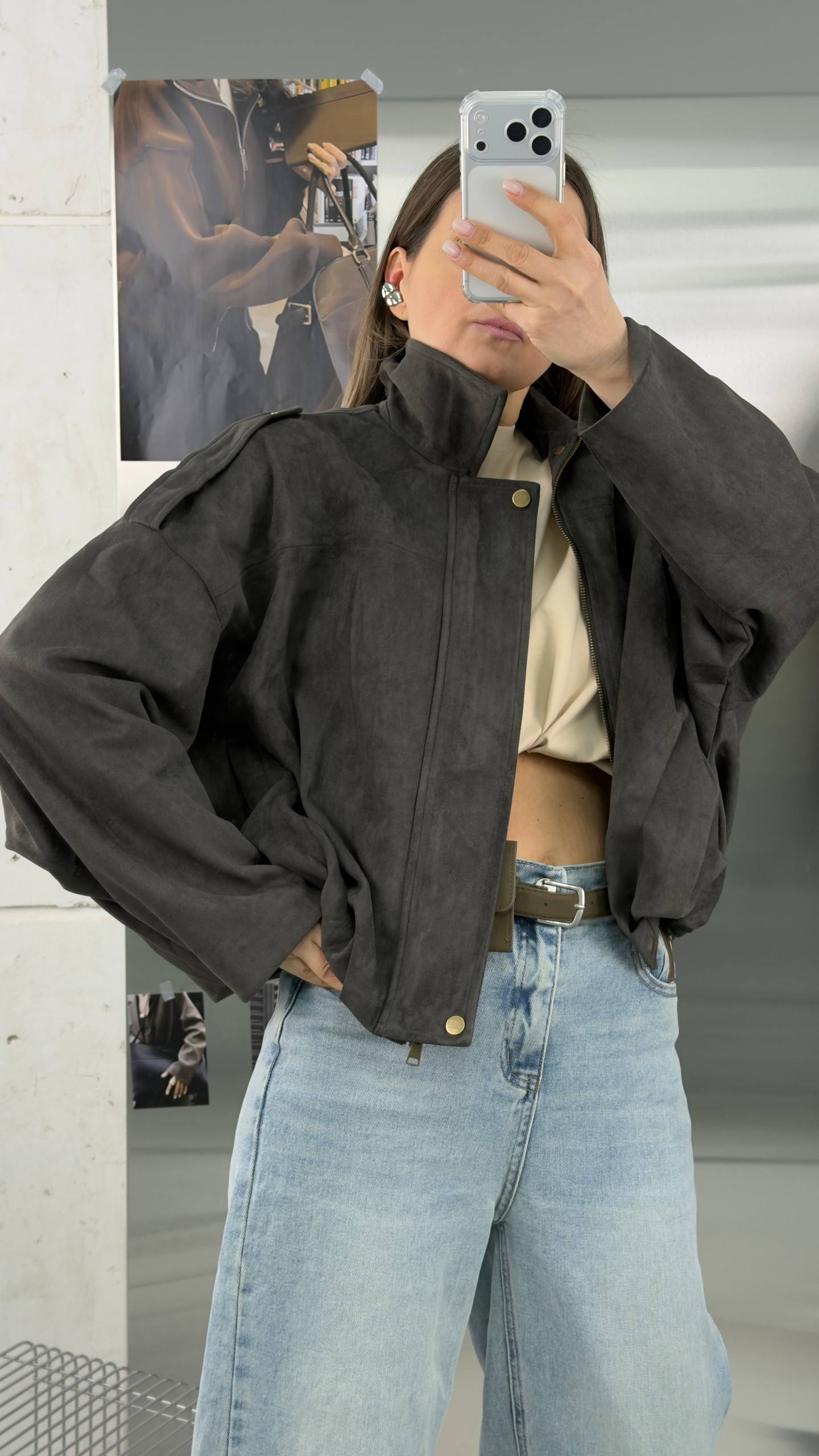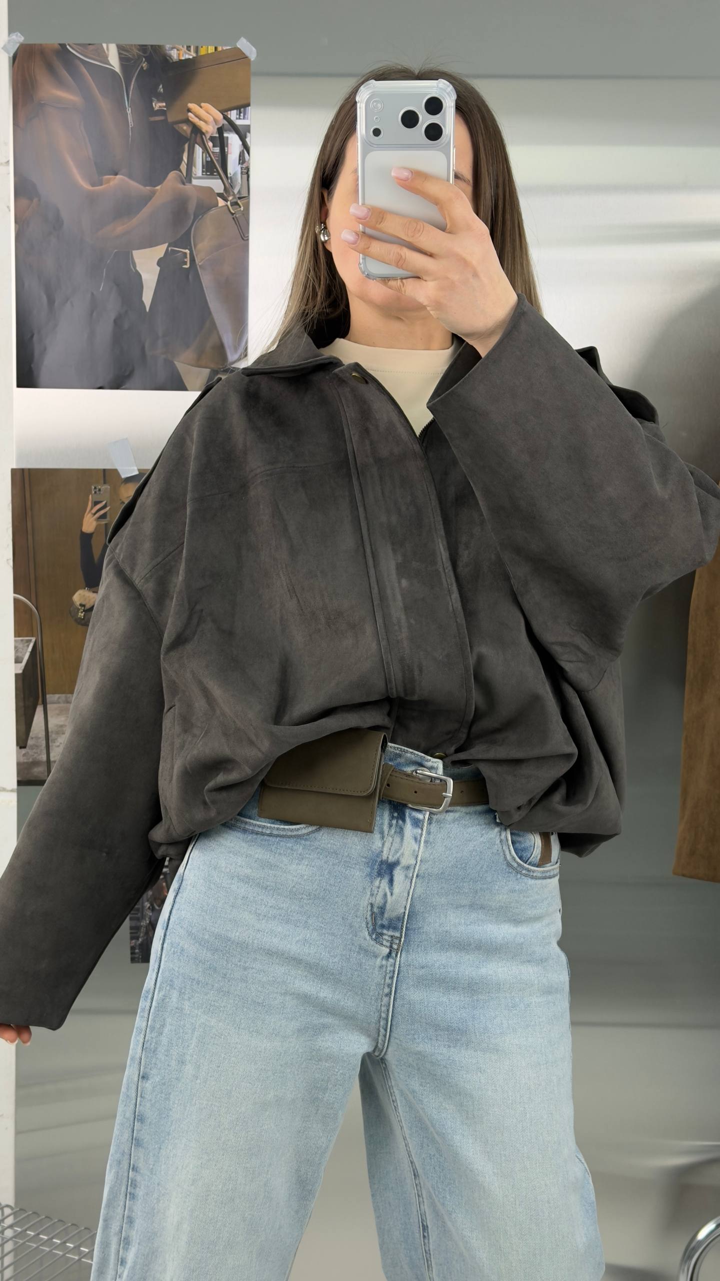 Короткий замшевый коричневый оверсайз бомбер - та самая вещь, которая всегда выручает в переходные сезоны. Легкая, мягкая и уютная куртка из экозамши станет вашим фаворитом на весну и осень, а также пригодится в прохладные летние вечера.