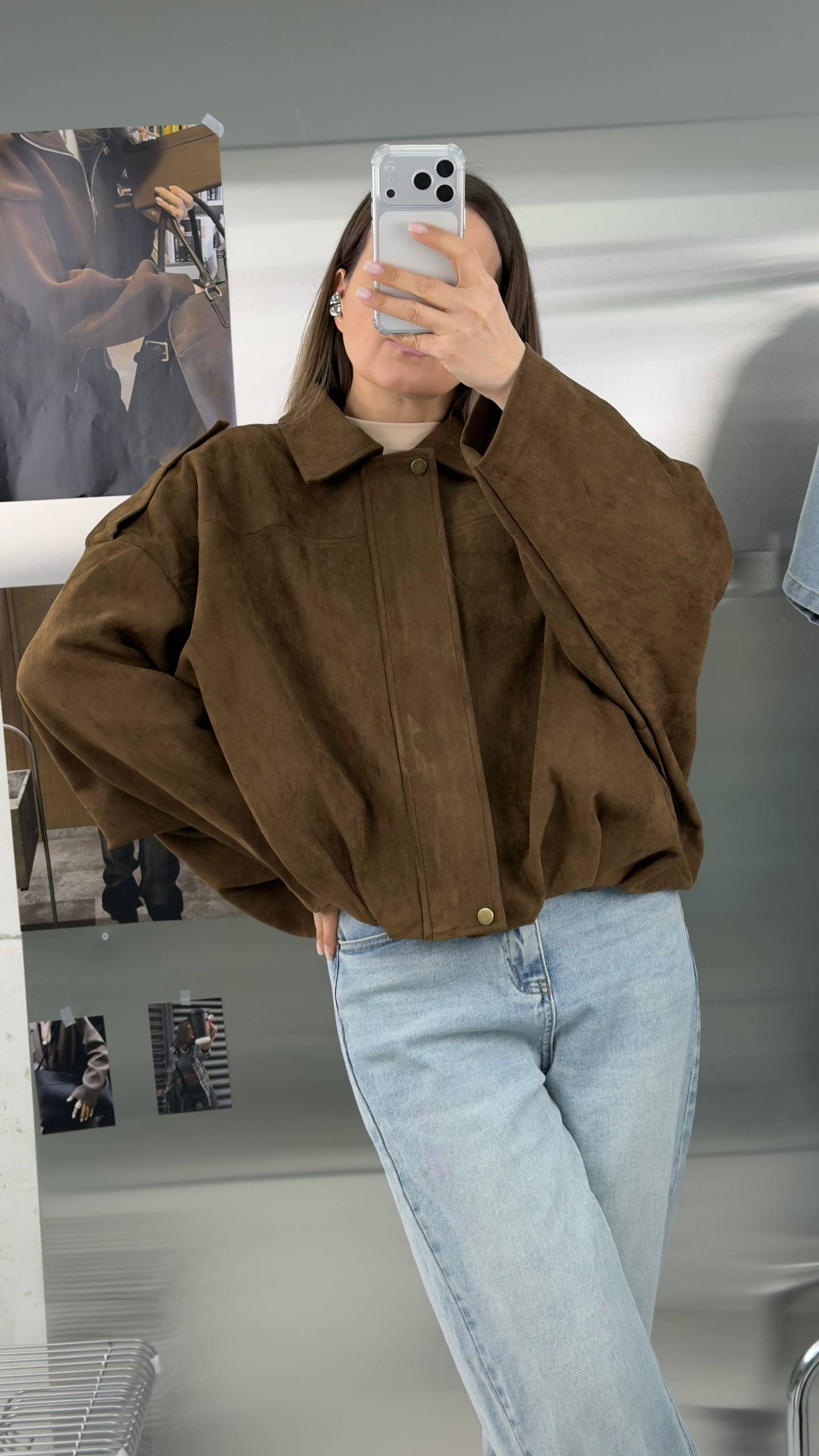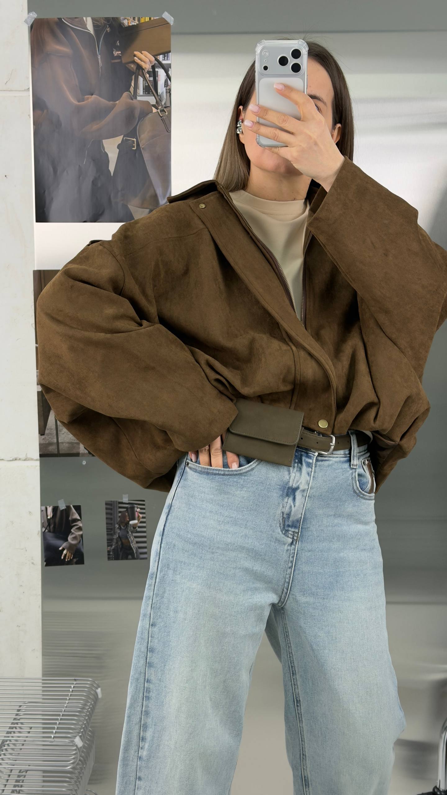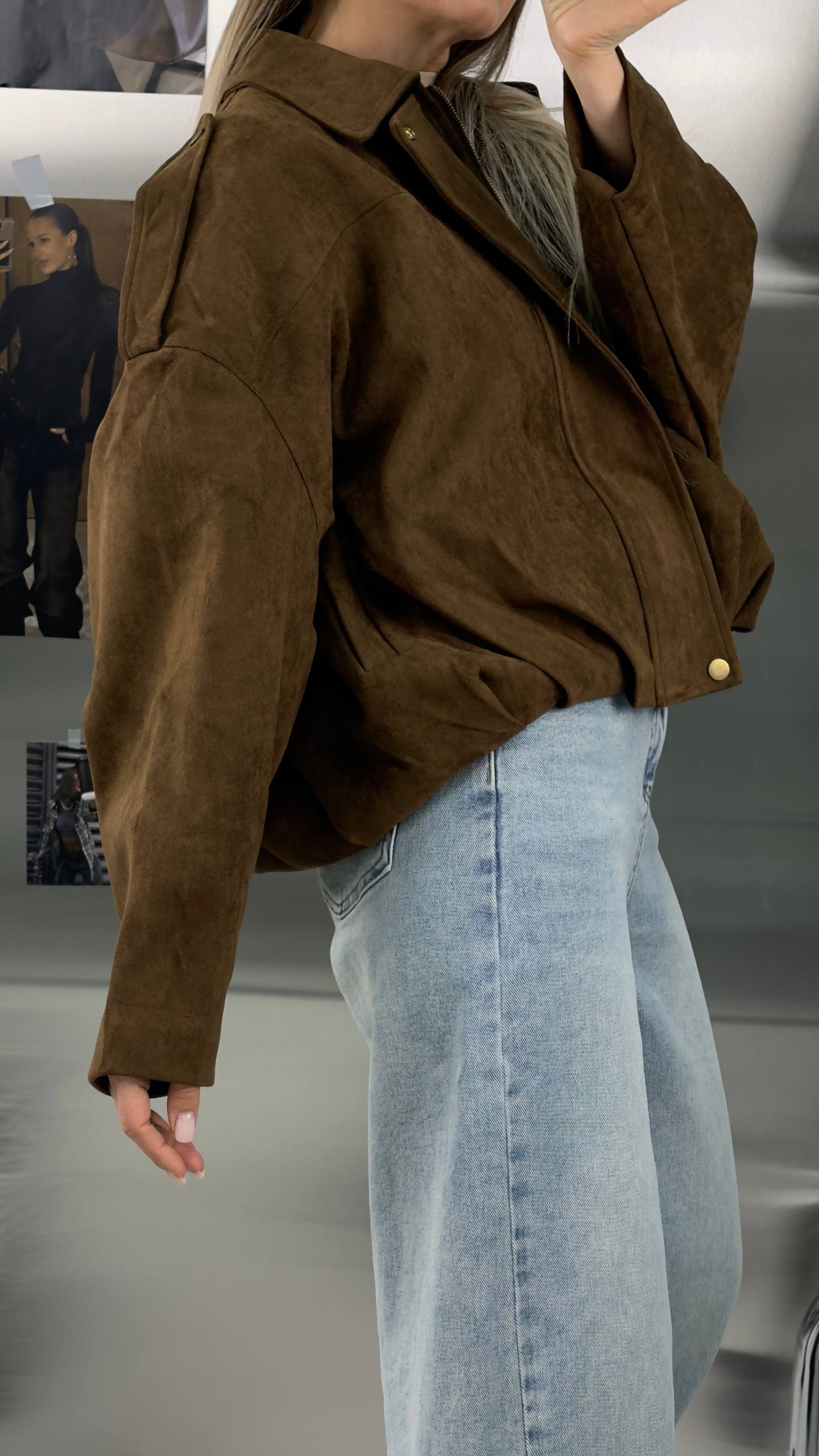 Короткий замшевый коричневый оверсайз бомбер - та самая вещь, которая всегда выручает в переходные сезоны. Легкая, мягкая и уютная куртка из экозамши станет вашим фаворитом на весну и осень, а также пригодится в прохладные летние вечера.